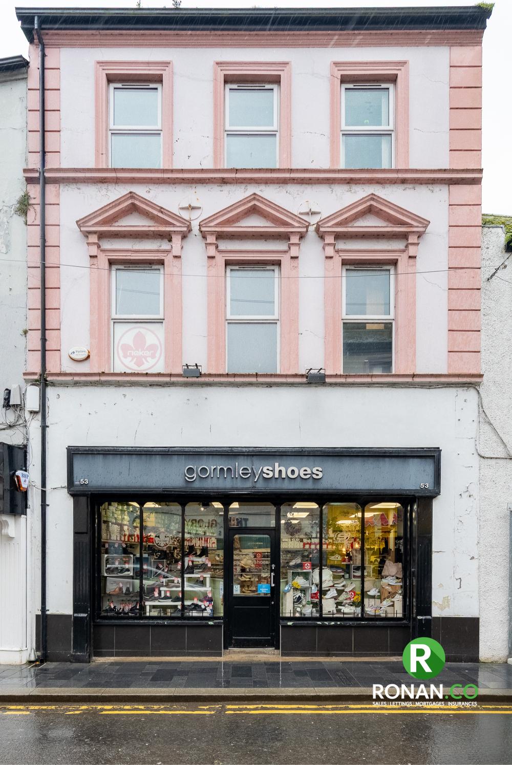 Ronan McAnenny Ltd is delighted to offer For Sale this renowned town centre commercial unit located on Main Street, Strabane. (Currently trading as Gormley Shoes). These premises occupy a highly prominent position on the Main Street with a high volume of passing traffic. Neighbours include Super Valu, McGoldrick Sports, McColgan’s Foodhall, Valerie Manning Jewellery, Boots & Bejeweled at Soul.